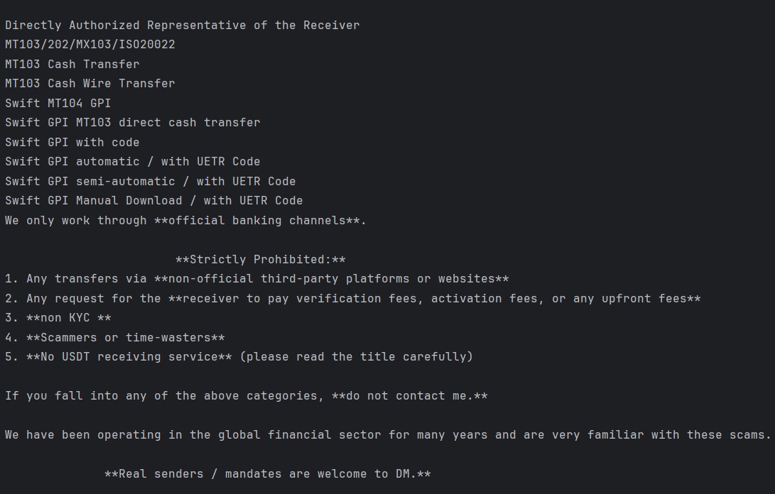 **Real senders / mandates are welcome to DM.**